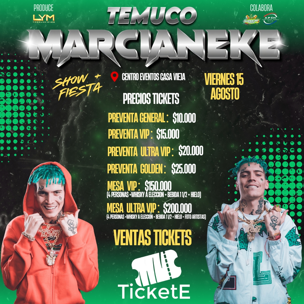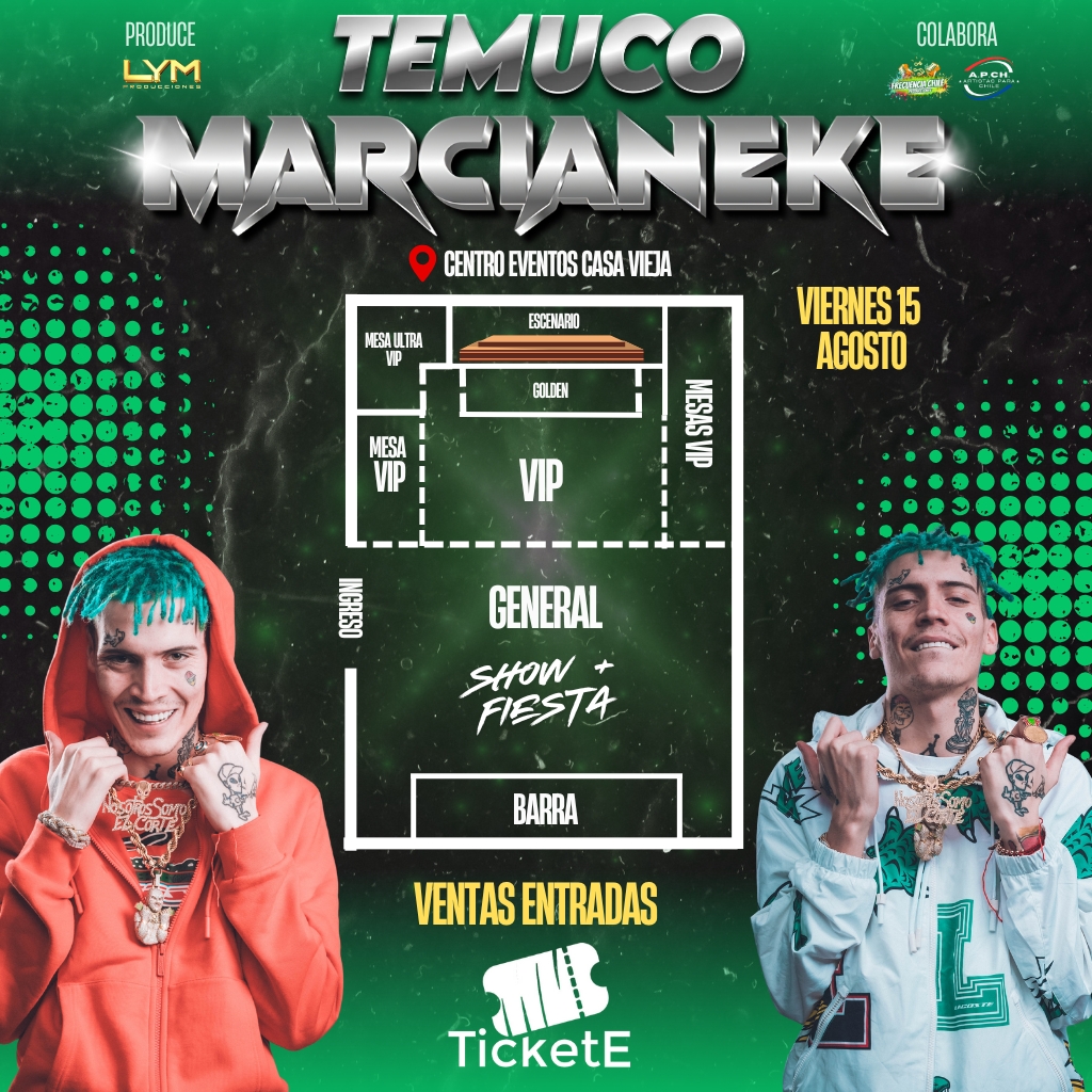 MARCIANEKE en Vivo! Lanzamos nuestra Primera Preventa, asà que no te pierdas esta oportunidad de ver al cantante chileno de música urbana, conocido por su estilo musical que mezcla trap y reggaetón.